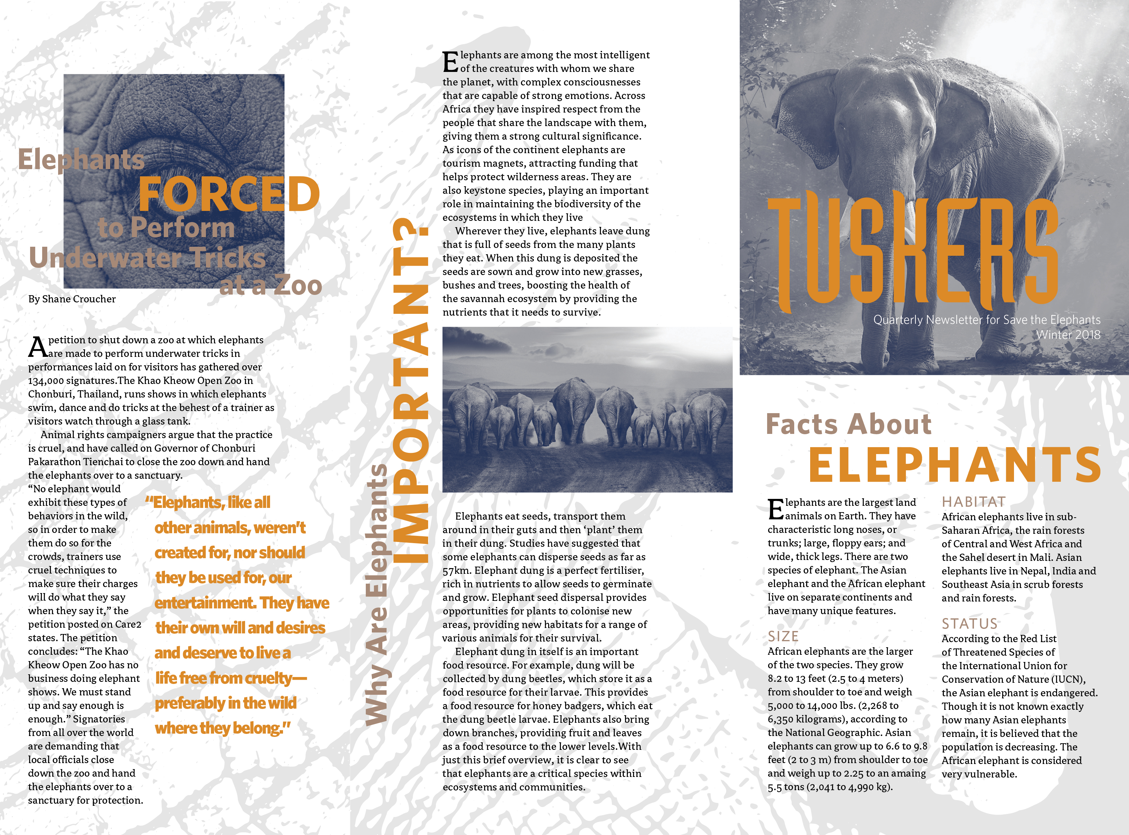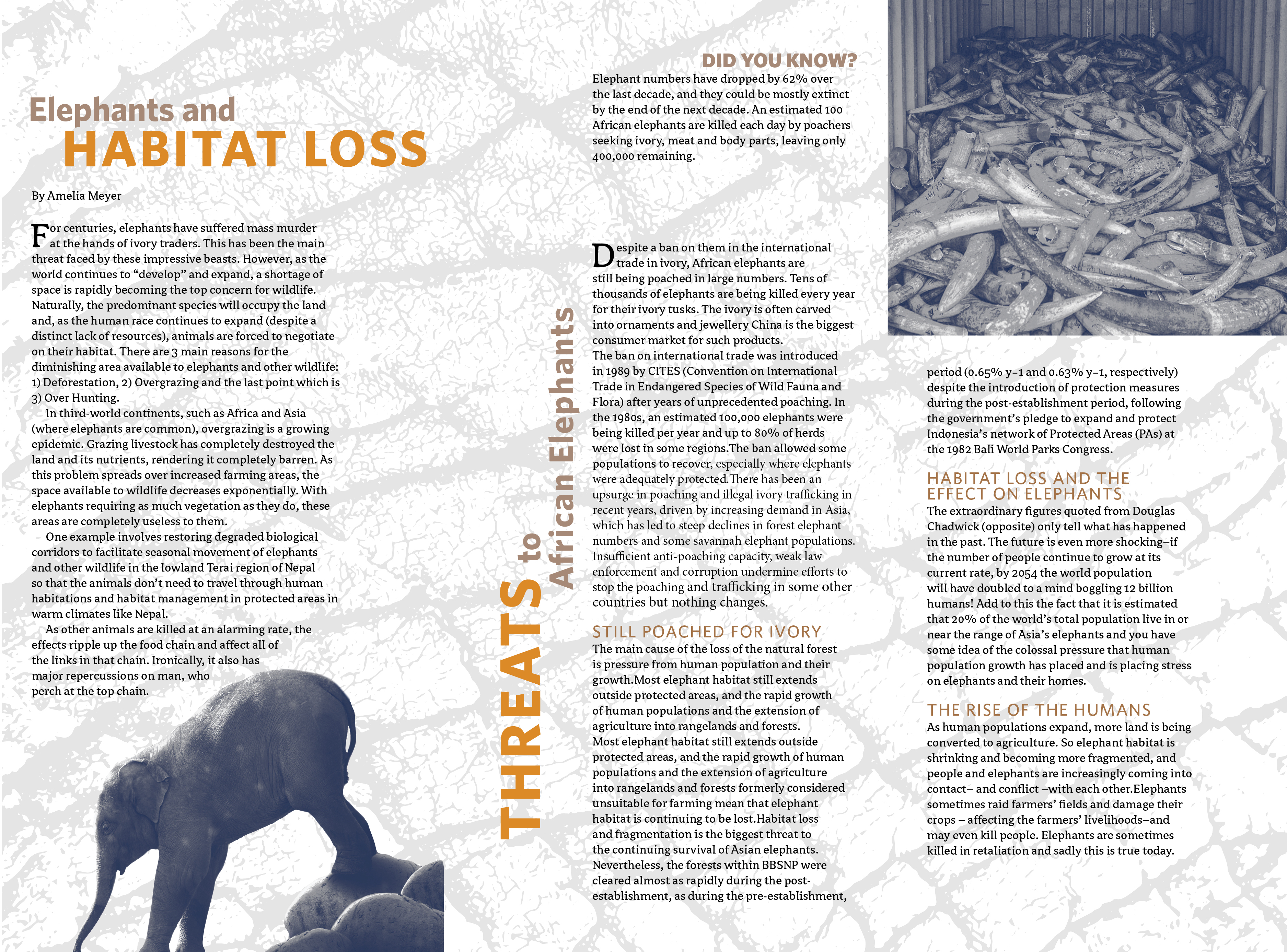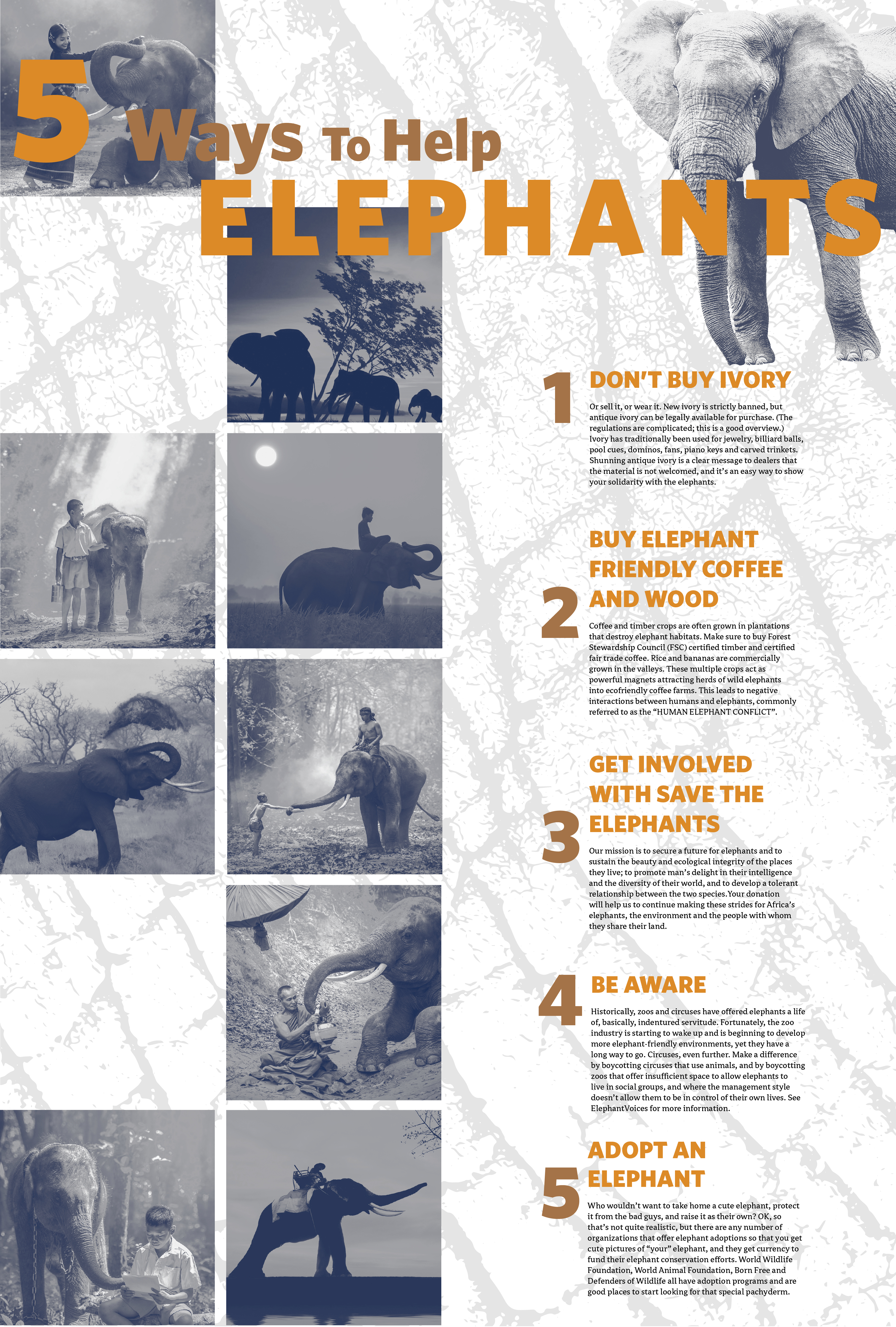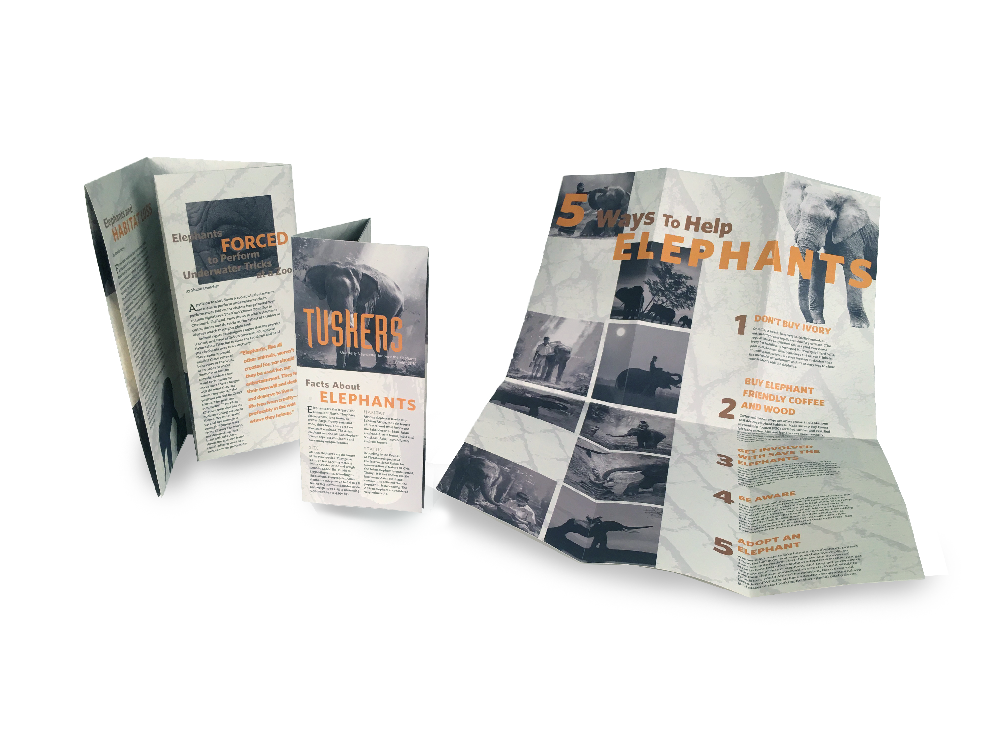 A newsletter that is trifold and features a poster on the inside. Duotone images and an elephant’s skin texture were used as graphic elements to emphasize the main idea of how these animals need to be saved. The Poster incorporates an interactive element in which the viewer can learn how they can contribute to the cause.